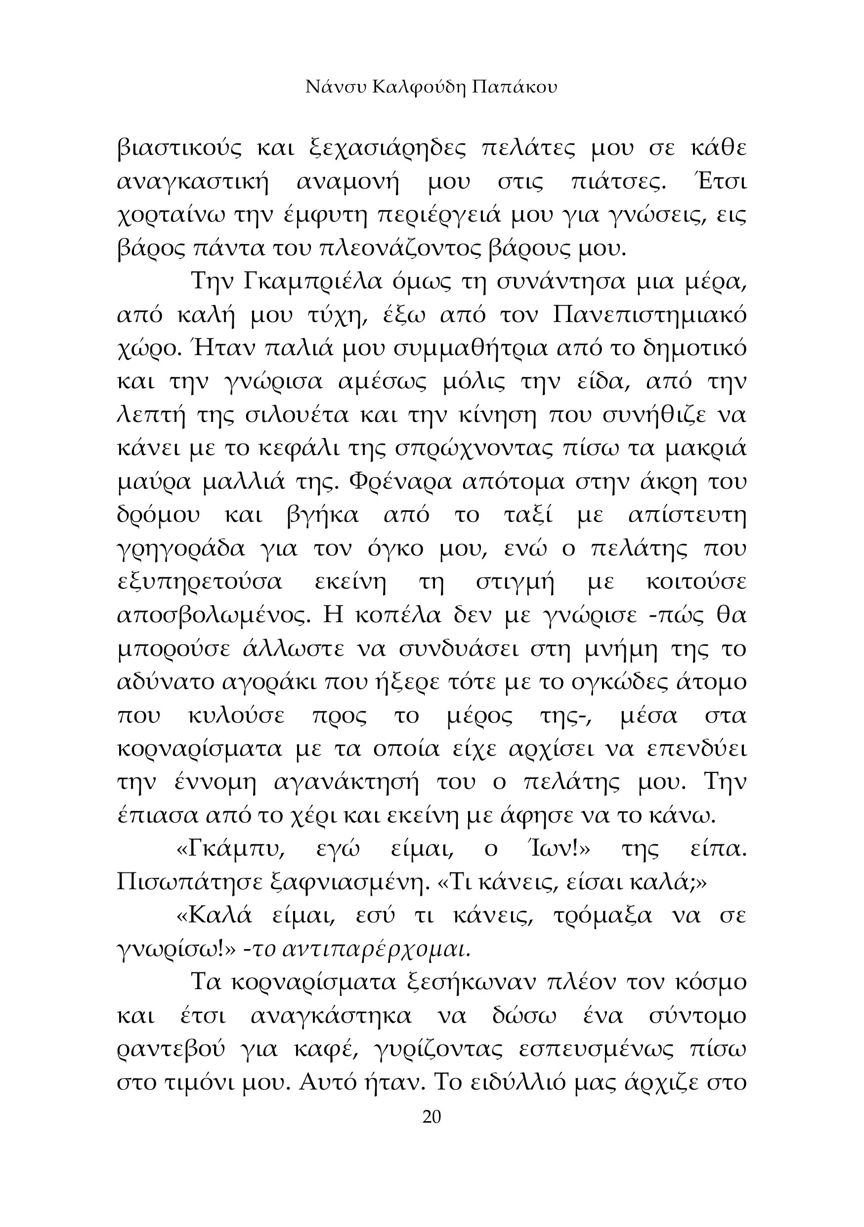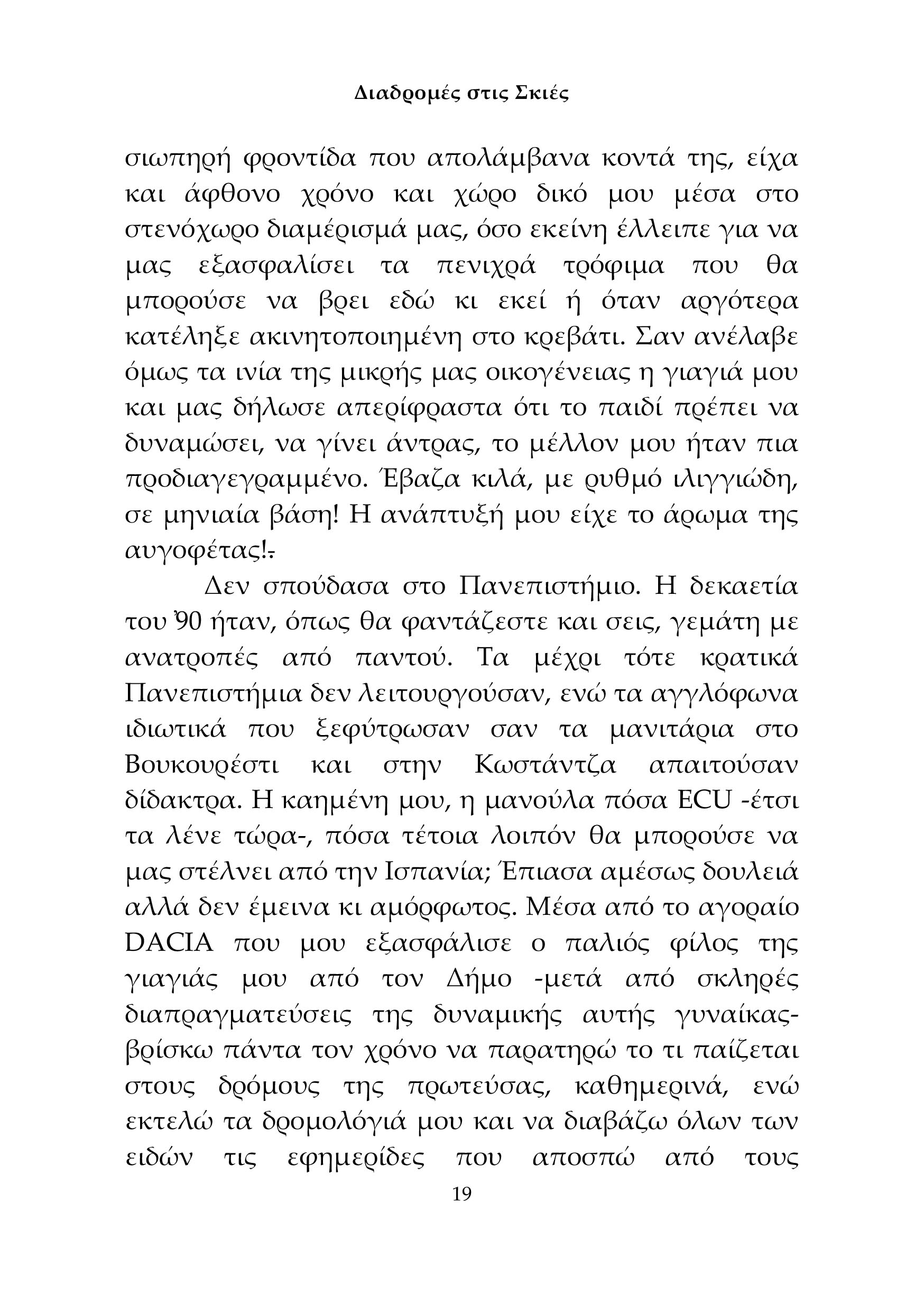 Στην Ρουμανία της μεγάλης μετάβασης, από τον υπαρκτό σοσιαλισμό του Τσαουσέσκου στην δυτικού τύπου κοινοβουλευτική δημοκρατία, η γενιά των 20 ετών προσπαθεί να προσαρμοστεί, μέσα από το «ράγισμα» των παραδοσιακών κοινωνικών σχέσεων, την μίμηση των δυτικόφερτων μοντέλων κοινωνικής συμπεριφοράς, ιδίως οι φοιτητές που δέχονται απροκάλυπτα και ανεξέλεγκτα τον δυτικό καταιγισμό ιδεών και απομιμήσεων. Από την άλλη, οι μεγαλύτερες γενιές που διαμορφώθηκαν στην σοσιαλιστική Ρουμανία μέχρι τότε, βιώνουν με βιαιότητα την κατάρρευση του κοινωνικού status τους, είτε μέσα από την φτωχοποίησή τους μέσα στην χώρα τους, είτε μέσα από την επαγγελματική υποβάθμισή τους στις χώρες που καταφεύγουν για κάτι καλύτερο και ας έχουν καλά τυπικά ή και ουσιαστικά εφόδια και γνώσεις …… Μέσα από την προσωπική ιστορία ενός νεαρού Ρουμάνου, ο οποίος είναι φυσικό τέκνο της μητέρας του, φαινόμενο σύνηθες στην κομμουνιστική και μετακομμουνιστική Ρουμανία αντέμνονται όλες οι ιστορικές και κοινωνικές μεταβολές της εποχής αυτής, με όλη την ένταση και τα αποτελέσματά τους. Η Νάνσυ Καλφούδη-Παπάκου διαρθρώνει με μαεστρία ένα ανάγλυφο ταμπλό όλων αυτών των γεγονότων και των εσωτερικών, συναισθηματικών και ψυχικών, αντανακλάσεών τους αναδεικνύοντας την πολυπλοκότητα και το βάθος των συνεπειών τους.