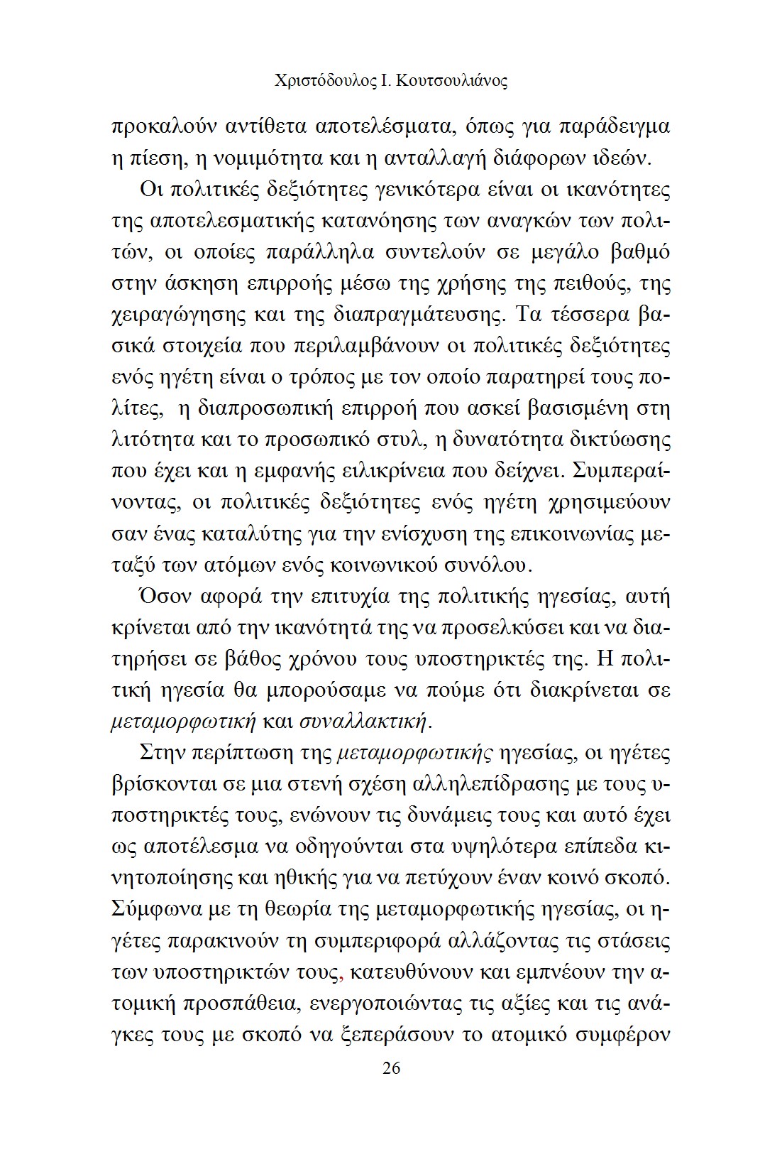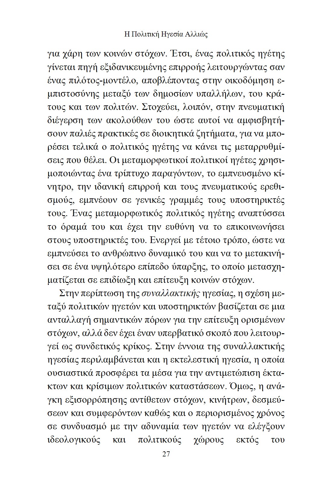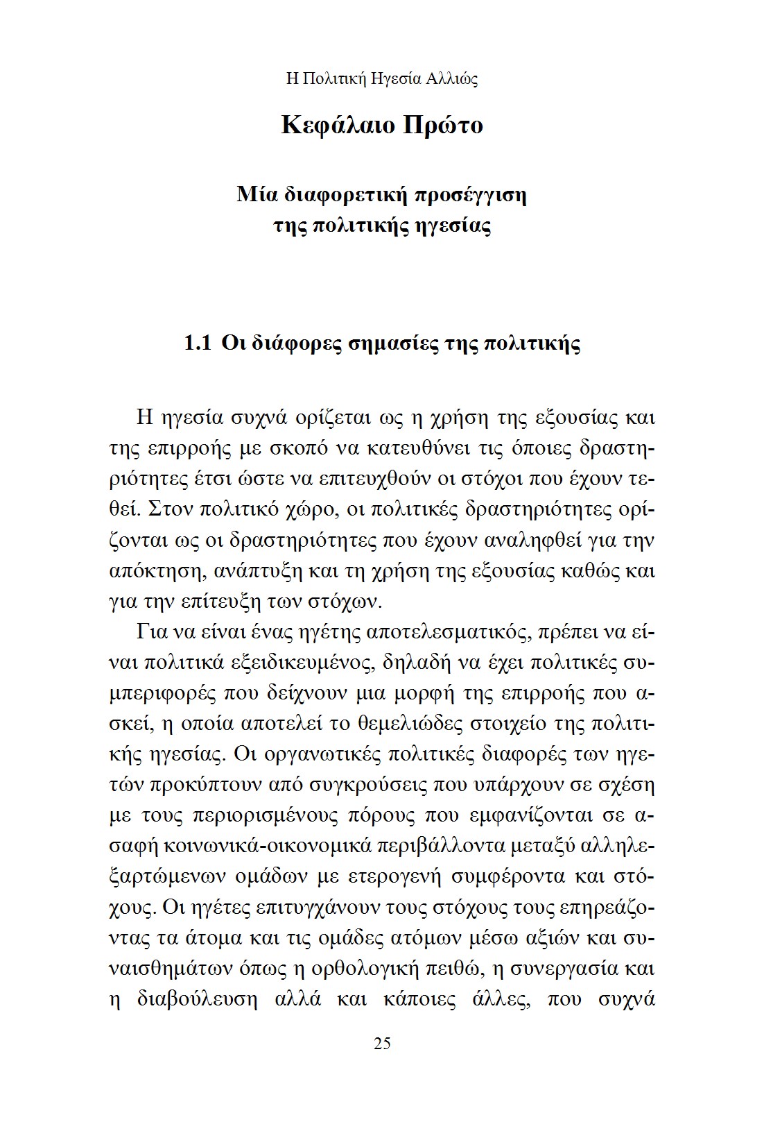Από την αρχαιότητα έως τις σύγχρονες κοινωνίες, η πολιτική ηγεσία αποτελεί ένα καίριο στοιχείο για την κατανόηση του τρόπου με τον οποίο διαμορφώνεται και εκτελείται η πολιτική. Στο βιβλίο αυτό, παρουσιάζεται μία εμπεριστατωμένη ανάλυση της πολιτικής ηγεσίας μέσα από διαφορετικές φιλοσοφικές, ιστορικές και θεωρητικές προσεγγίσεις, καθώς και την χρησιμότητά της κατά την πάροδο του χρόνου.