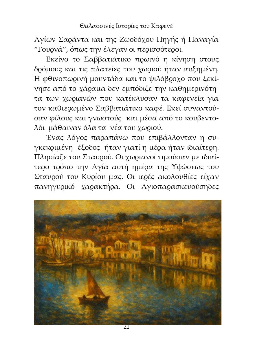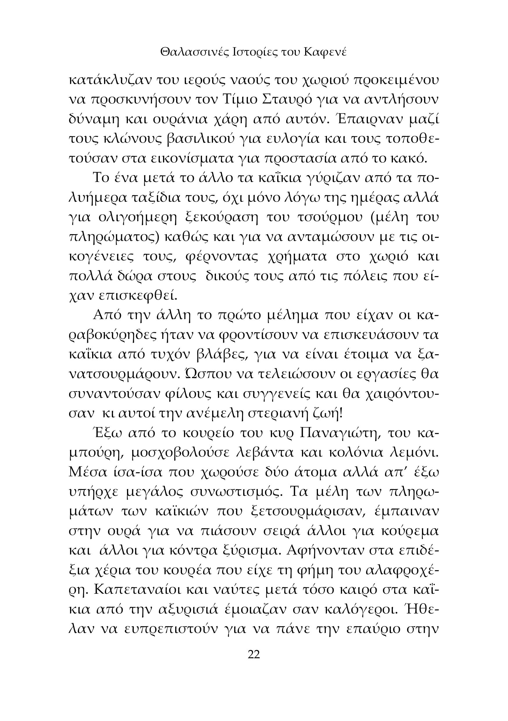 Το βιβλίο αυτό είναι ένας περίπατος στη μνήμη και στη θάλασσα. Εννιά ιστορίες και ένα παραμύθι, που γεννήθηκαν από τα λόγια παλιών ψαράδων στα καφενεία. Ιστορίες για καλάδες, για φουρτούνες, για μπουνάτσες, για συνήθειες, δοξασίες και θρύλους που ταξίδευαν από στόμα σε στόμα, παίρνουν μορφή και γίνονται διηγήματα. Με μύθο και αλήθεια πλεγμένα, ενώνονται σε ένα μωσαϊκό λαογραφίας και παράδοσης, φωτίζοντας έναν κόσμο σκληρό αλλά και βαθιά ανθρώπινο και ζωντανεύουν εικόνες μιας άλλης εποχής. Κρατούν ζωντανό τον κόσμο των ψαροκάικων, των τρόπων ψαρέματος, τις συνήθειες, τις χαρές και τους καημούς μιας ζωής δεμένης με τη θάλασσα.