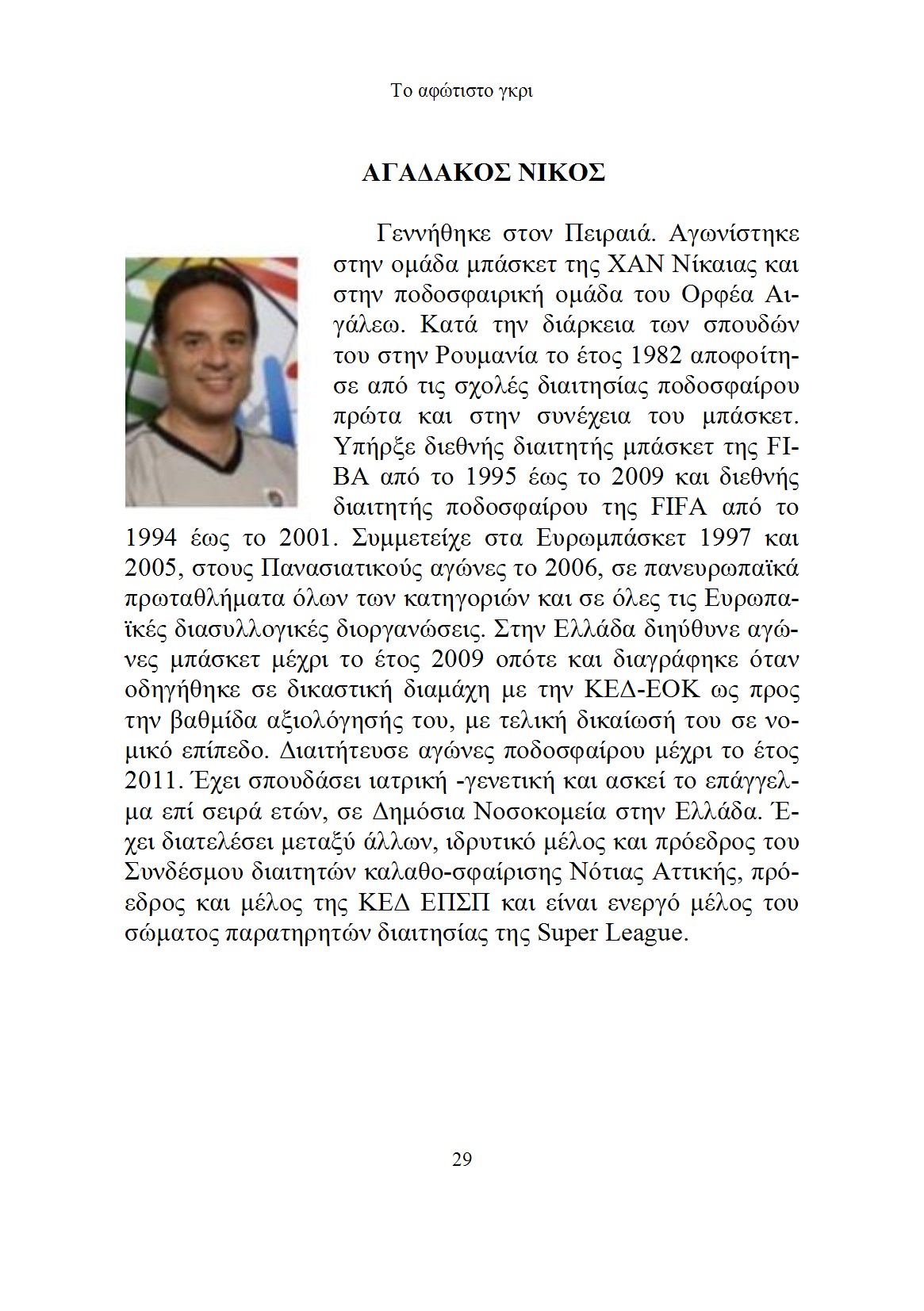 Το «Αφώτιστο Γκρι» είναι το βιβλίο της ιστορίας της Ελληνικής διαιτησίας του μπάσκετ. Περιέχονται σε αυτό, πάνω από 100 επιλεγμένα βιογραφικά Ελλήνων διαιτητών από τα πρώτα χρόνια εμφάνισης του αθλήματος στη χώρα μας μέχρι και τη σημερινή σύγχρονη εποχή. Γράφτηκε για να καλύψει ένα κενό της αθλητικής μας ιστορίας και να φωτίσει αφανείς οδοιπόρους της μακρόχρονης πορείας του μπάσκετ στην Ελλάδα. Η Ελληνική διαιτησία έχει αναδείξει δύο “Hall of famer” καθώς και άλλους διαιτητές που συμμετείχαν σε διεθνείς τελικούς αγώνες. Συμπεριλαμβάνονται όμως και πρόσωπα με πολύχρονη εγχώρια αγωνιστική παρουσία και άλλα με αθόρυβη πολύτιμη προσφορά στην οργάνωση, ανάπτυξη και διάδοση της διαιτησίας στην χώρα μας. Το βιβλίο δεν σχετίζεται με κάποιον αθλητικό φορέα, εταιρεία, σύνδεσμο ή αθλητική Ένωση και τα συγγραφικά δικαιώματα θα διατεθούν στον Σύλλογο Παλαιμάχων Αθλητών Καλαθοσφαίρισης Ελλάδος.